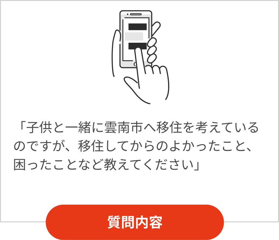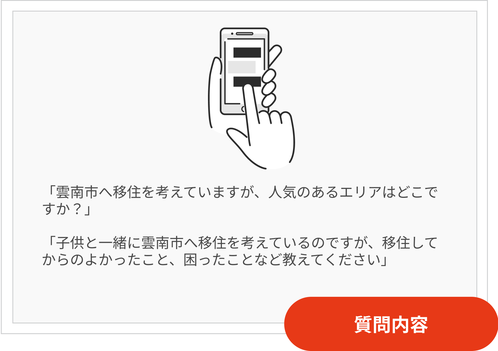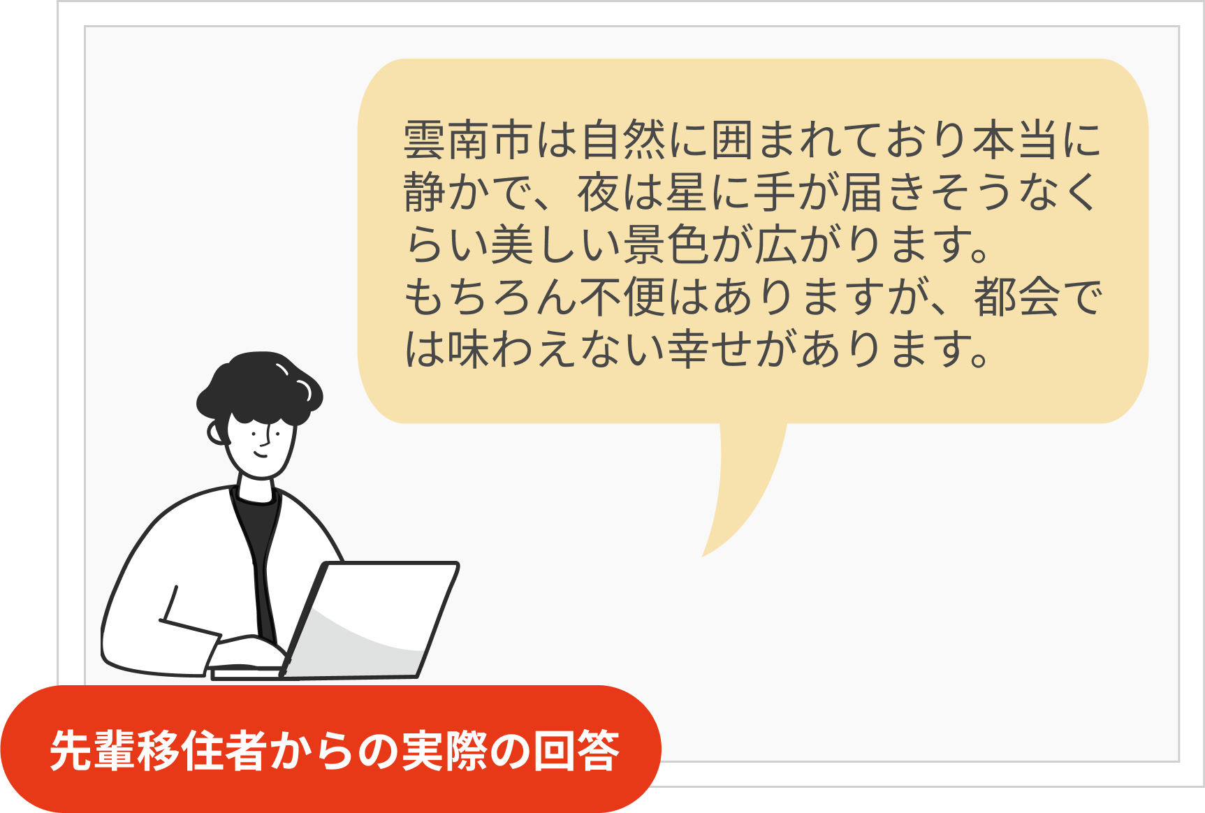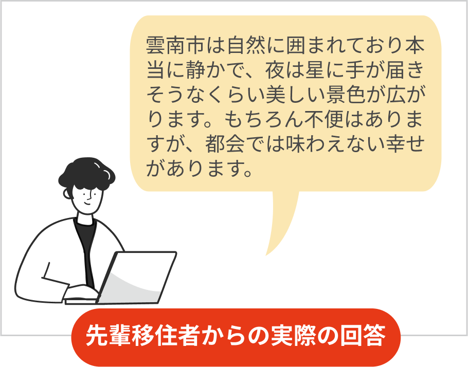 実際にその場所への移住を経験したさまざまな先輩移住者や、雲南市にくわしい方が体験談をベースにあなたにあった情報やアドバイスを提供するサービスです。